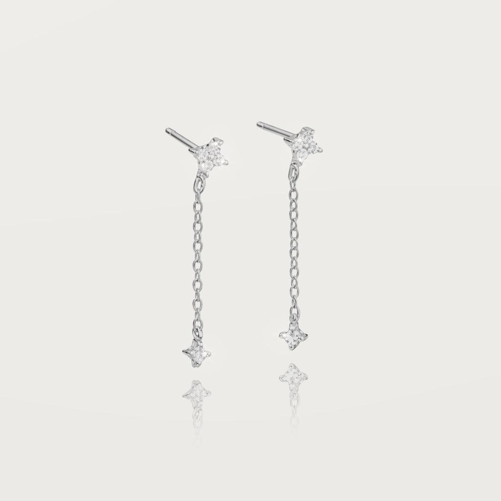 Design : Boucles d’oreilles pendantes avec étoile sertie, reliée par une fine chaîne