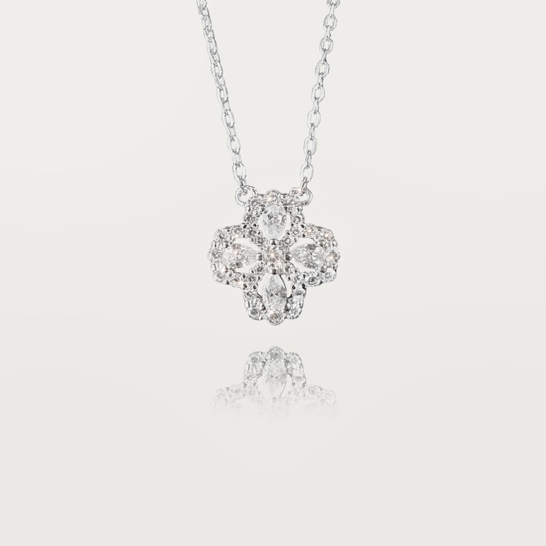 Ce collier met à l’honneur le trèfle, porte-bonheur universel, dans une version pavée de zircons étincelants. Chaque pétale, finement travaillé, reflète la lumière pour créer un jeu d’éclats subtil et raffiné.