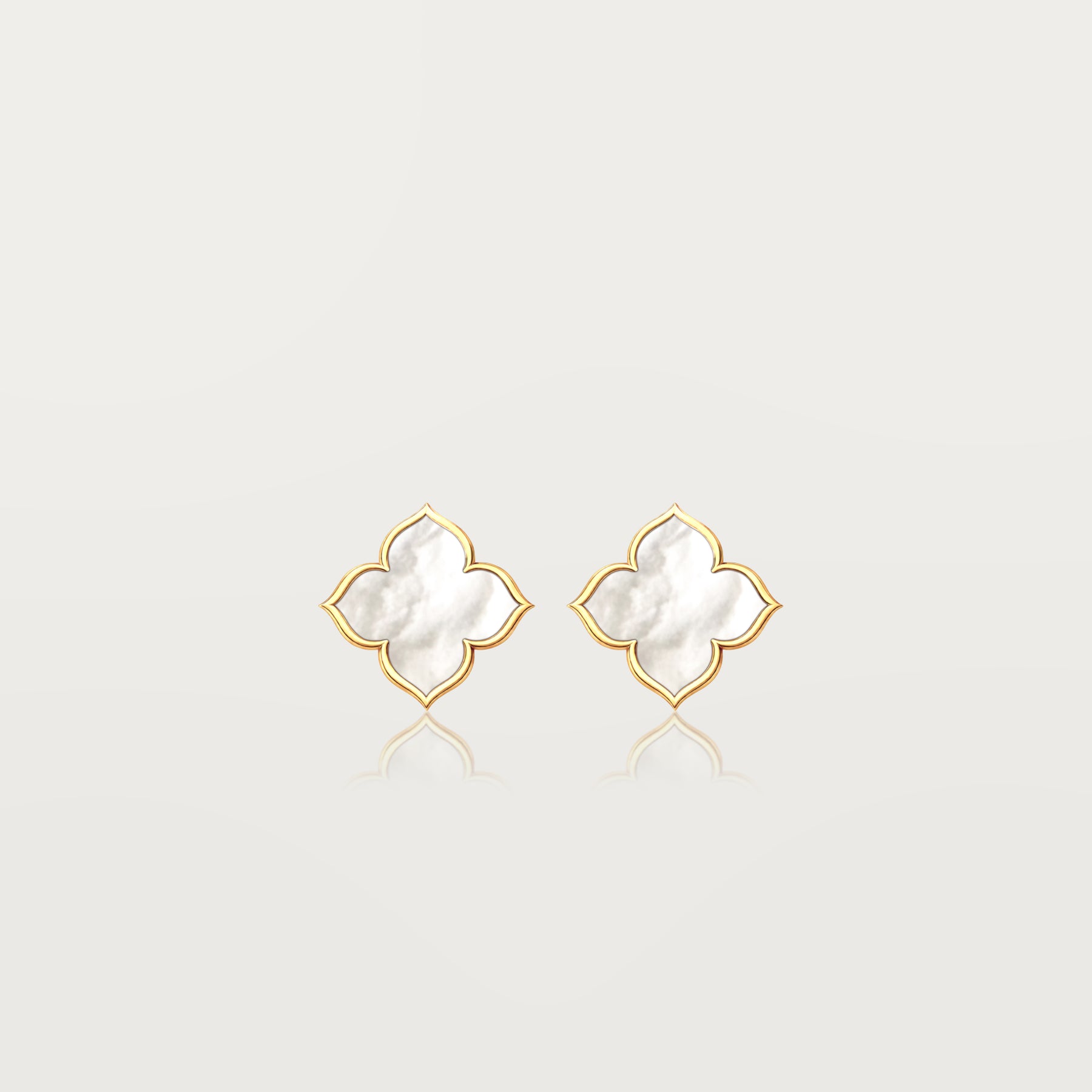La nacre naturelle, subtilement irisée, capte la lumière avec douceur, tandis que le contour en or 18 carats dessine une silhouette raffinée et aérienne, signature de la maison.