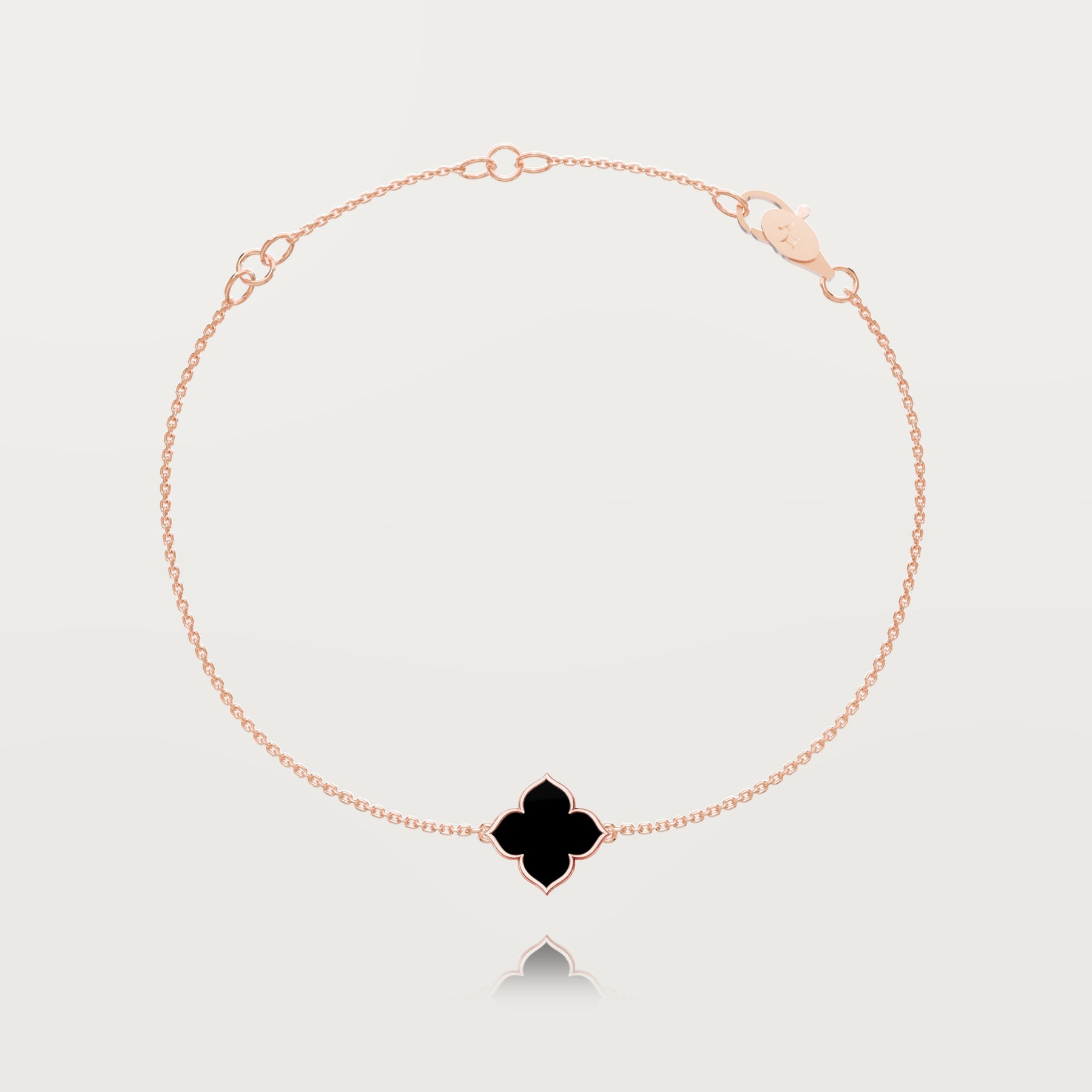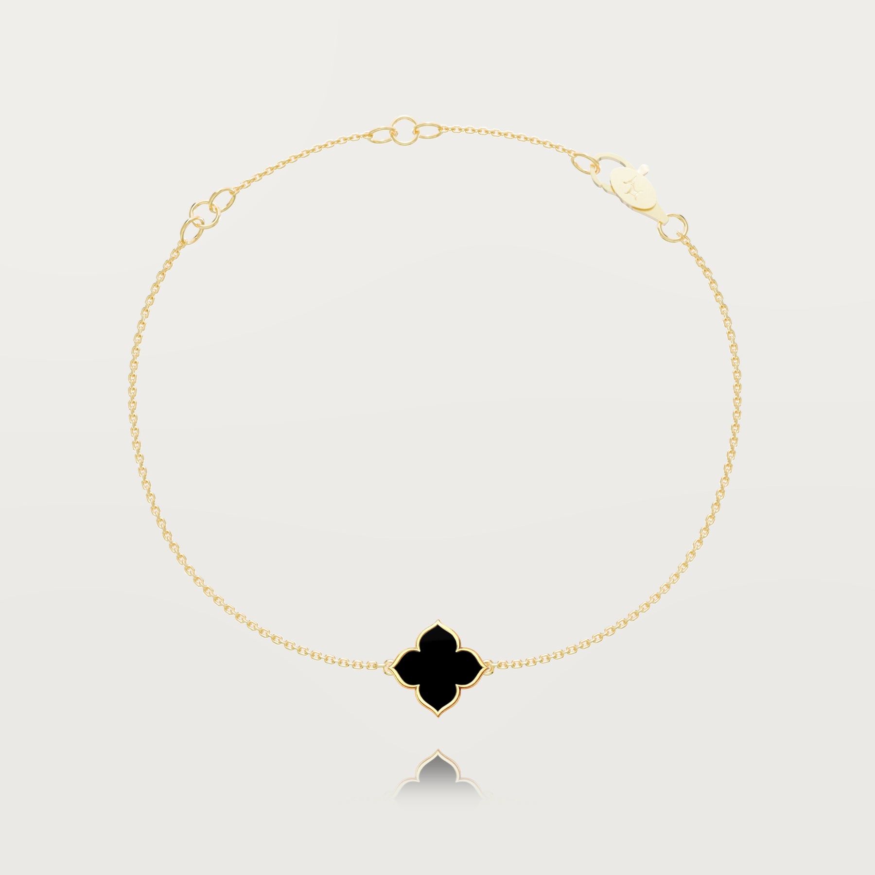 Onyx, chosen for its visual density and contained light, draws the eye and lends the jewel an almost talismanic presence. The perfectly balanced central motif rests naturally on the wrist, like a discreet force.