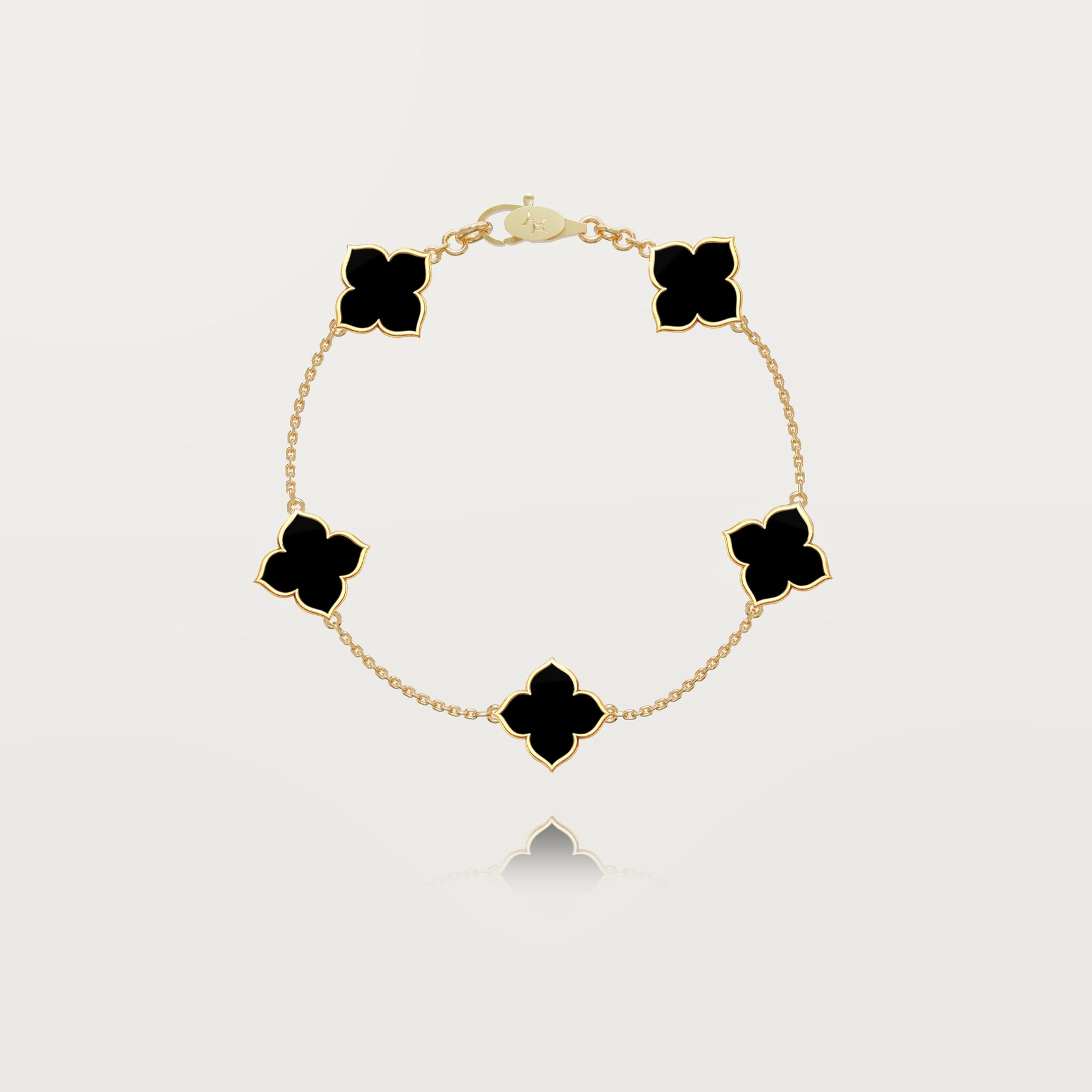 Its openwork clover motifs in 18-carat gold, enhanced by a deep black natural onyx, create a refined and magnetic line around the wrist.