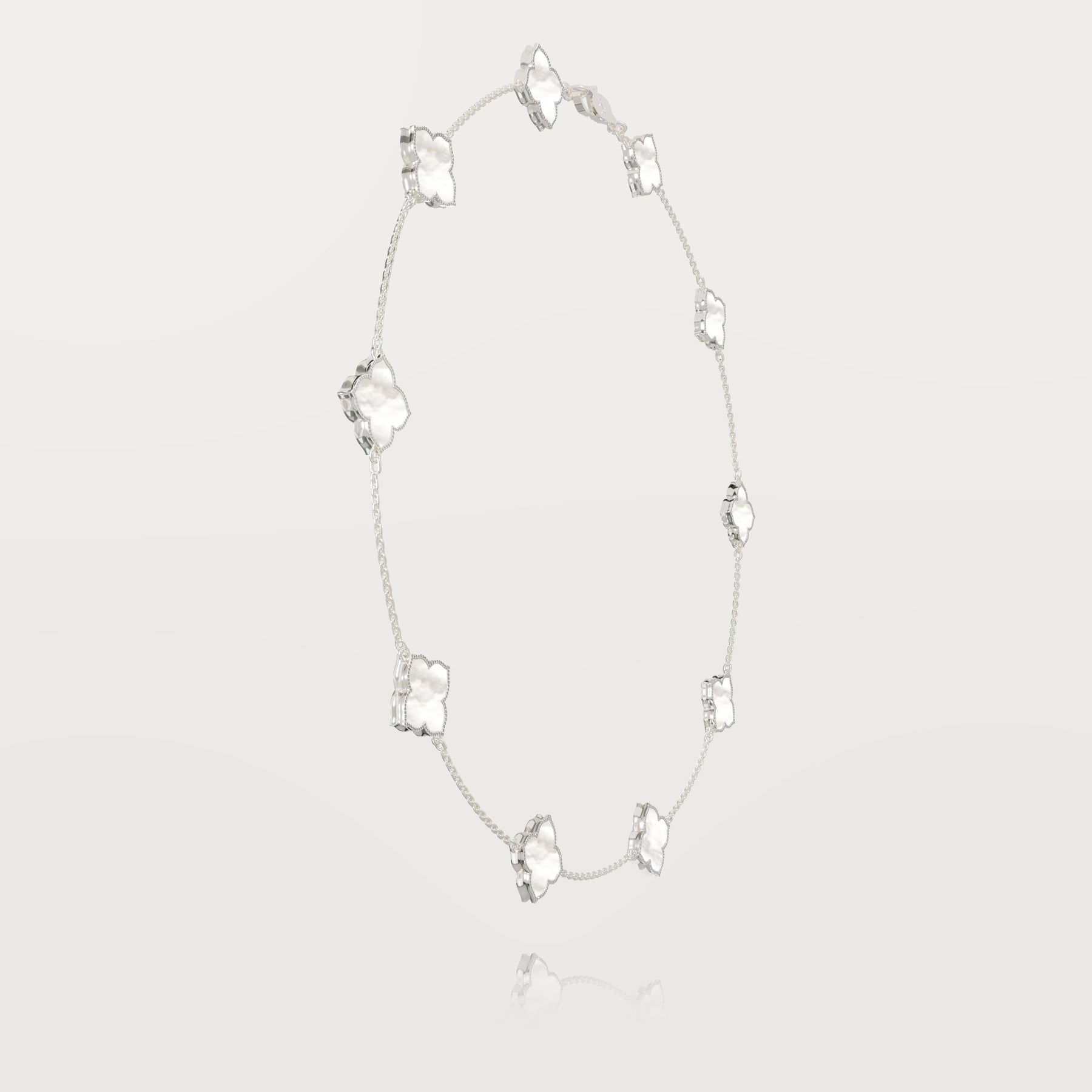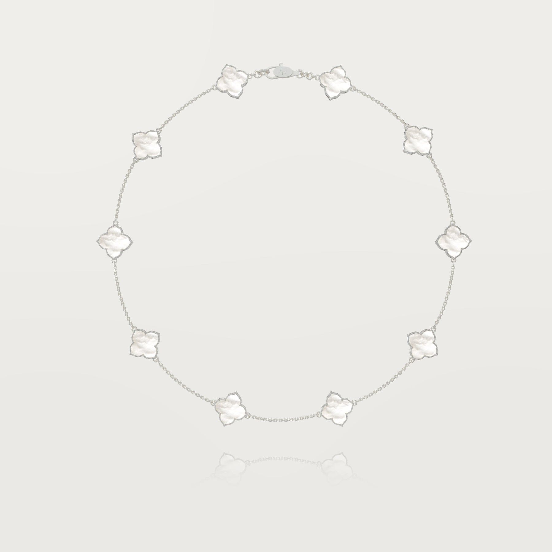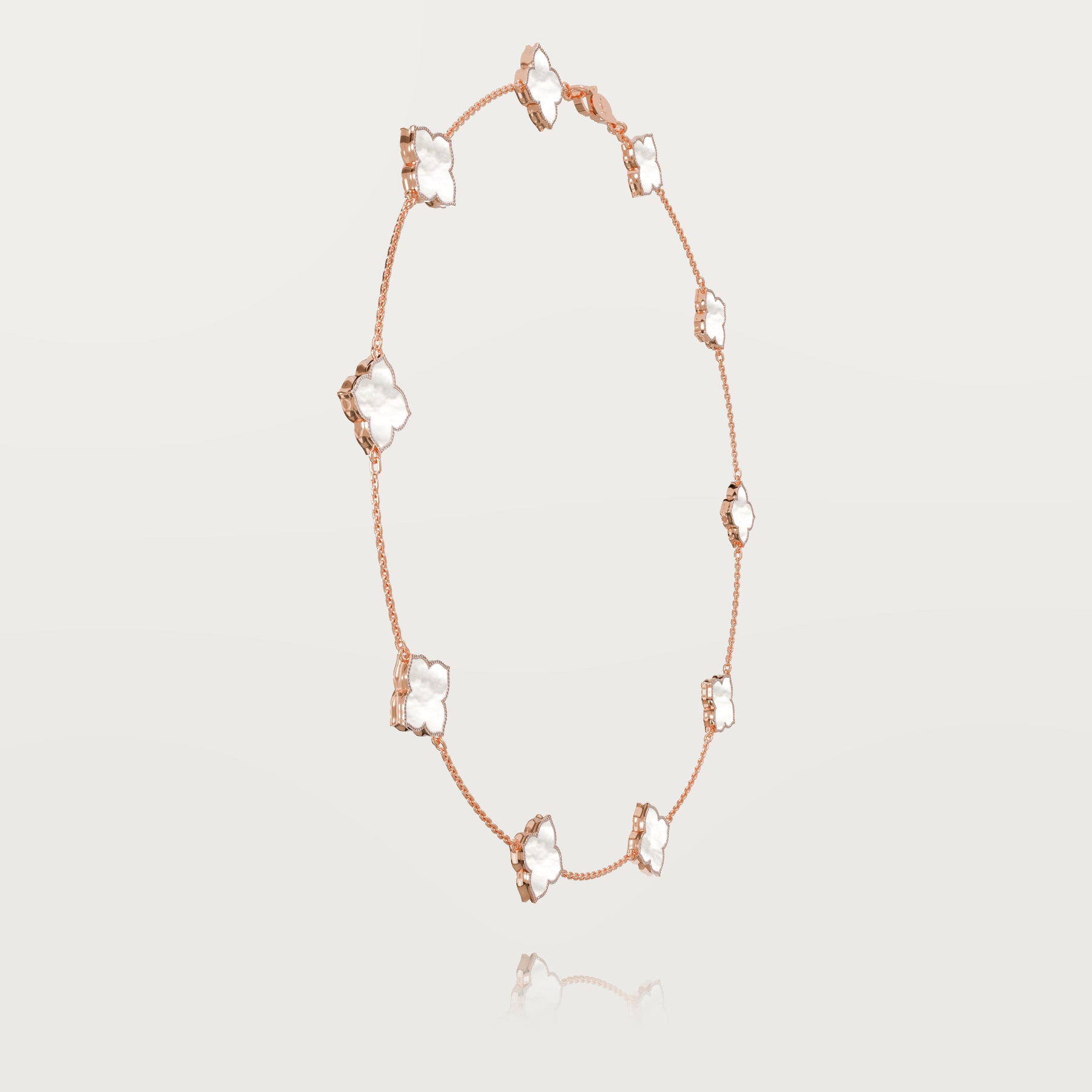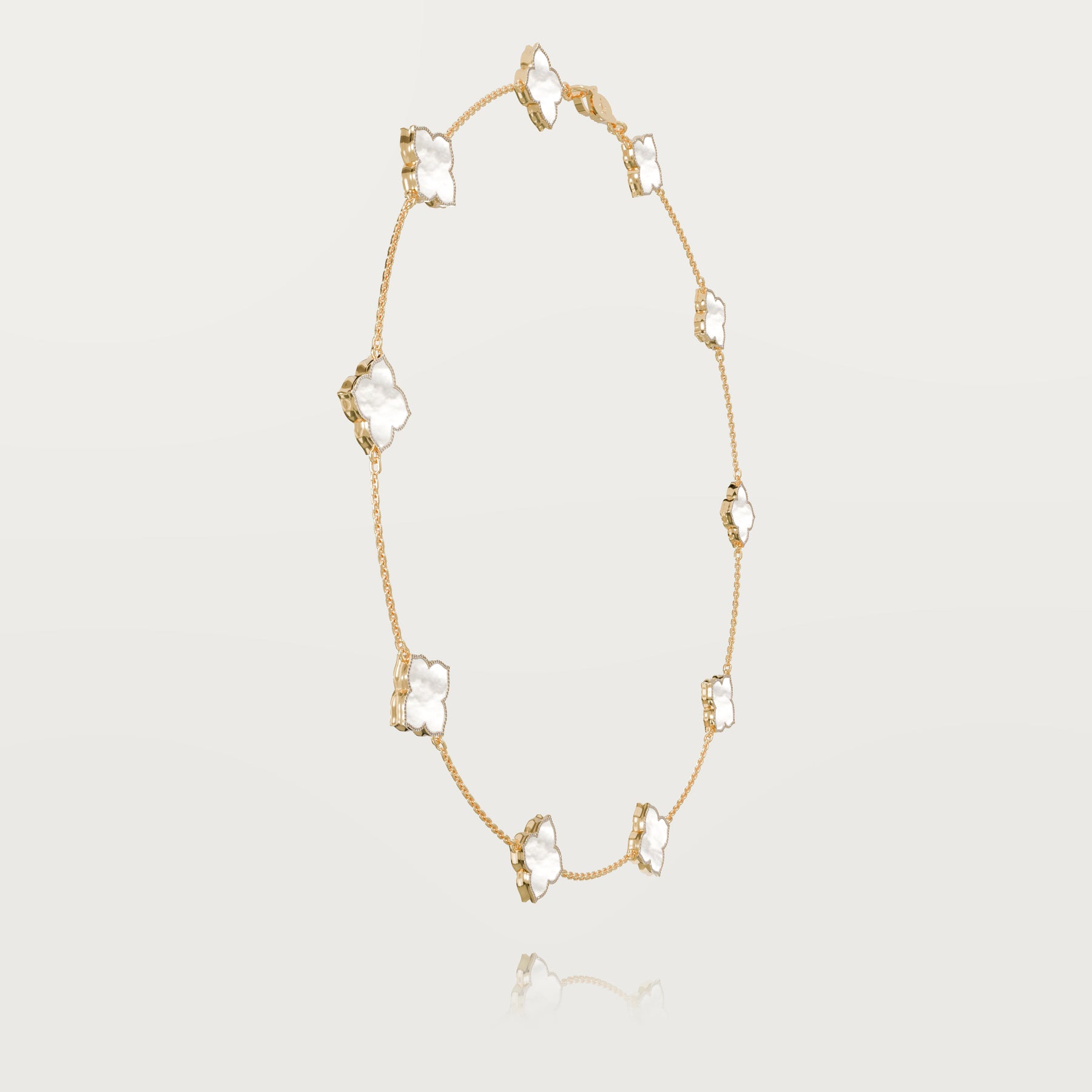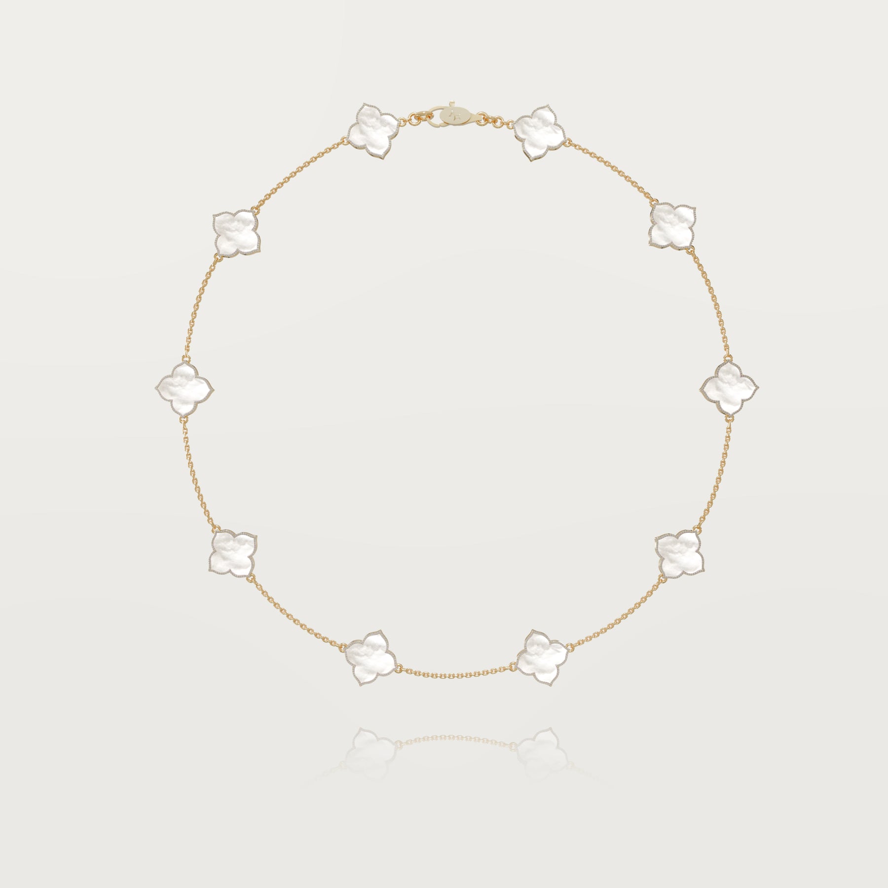 Explore exclusivity with our 18-karat gold necklace featuring ten reimagined clovers, each delicately rounded but adorned with a pointed tip for a distinctive touch. Bordered with FG-VS white diamonds, this jewel sparkles brilliantly.