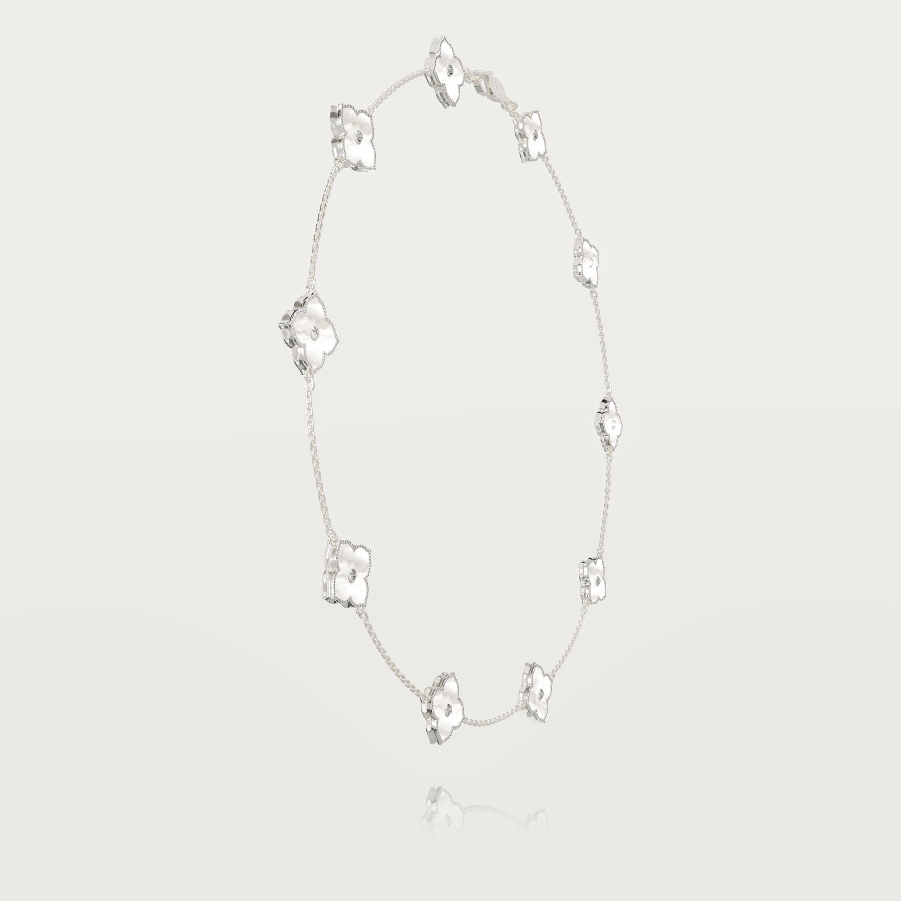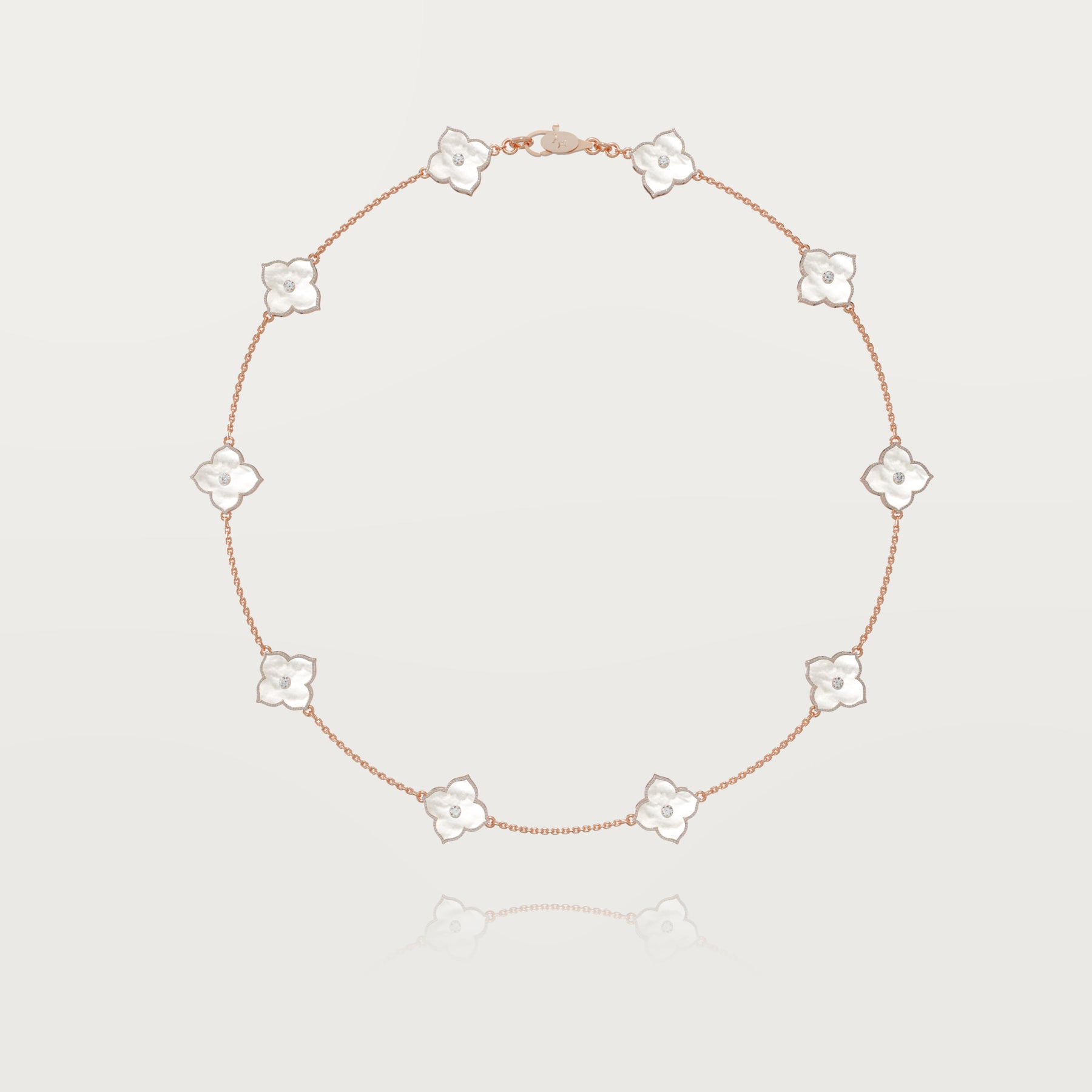 Discover the exclusivity of our 18-karat gold necklace featuring seven reimagined clovers, each adorned with a central FG-VS quality diamond and measuring 1.5 cm x 1.5 cm. Each clover is delicately rounded but finished with a pointed tip, offering a distinctive touch. Bordered by FG-VS white diamonds, this jewel sparkles brilliantly.