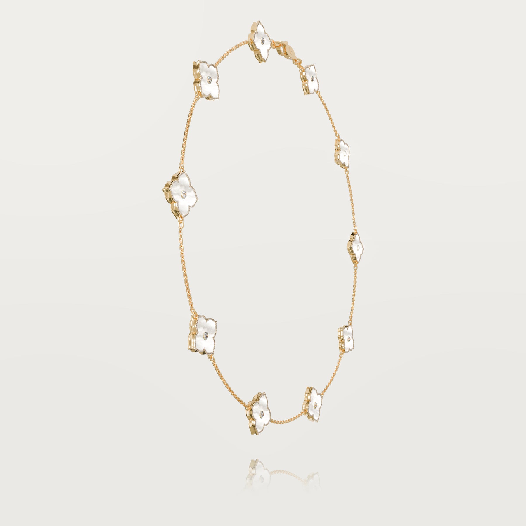 Design: Seven gold clovers measuring 1.5 cm x 1.5 cm, surrounded by diamonds.