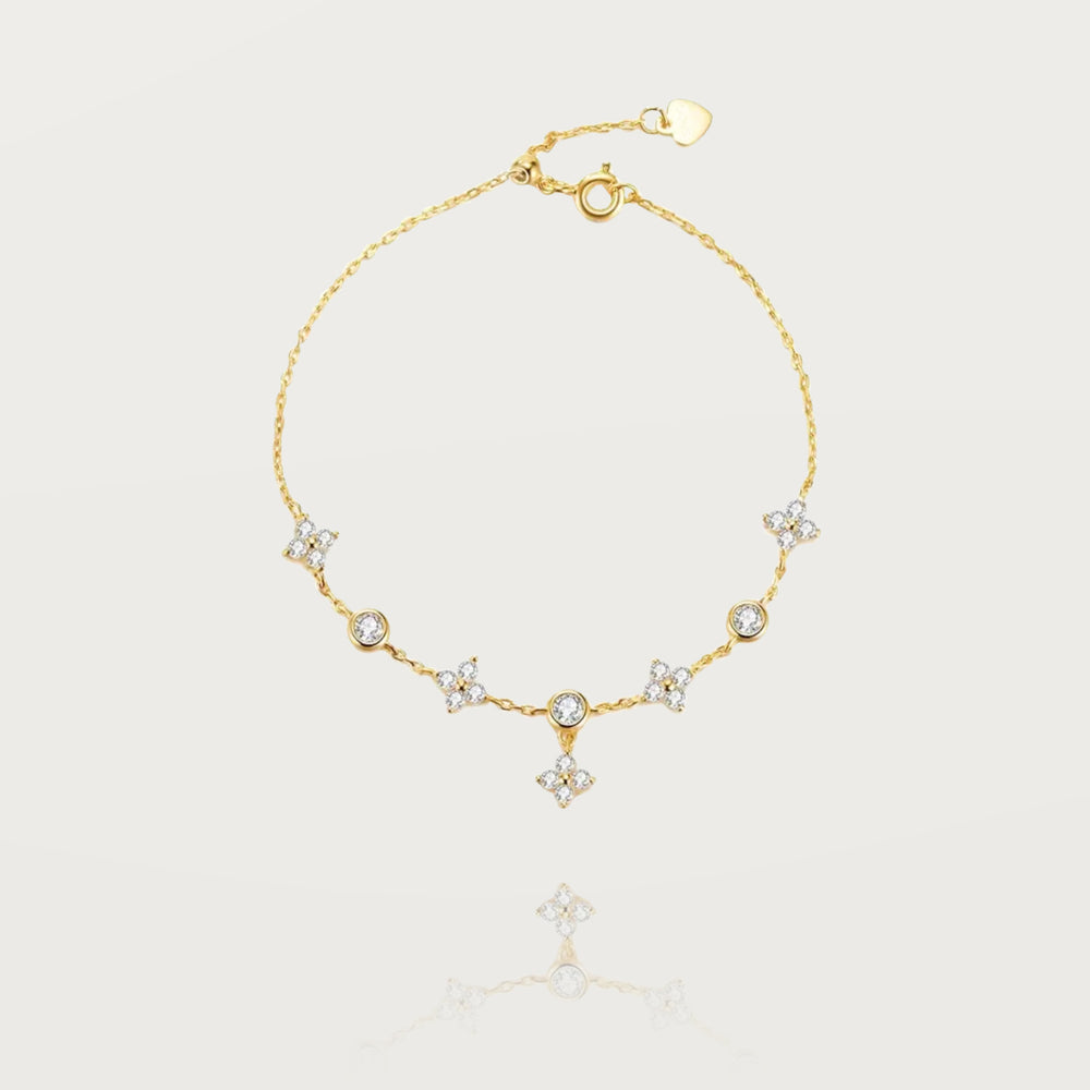 Délicat et raffiné, ce bracelet est une pièce subtile qui capte la lumière avec élégance. Son design harmonieux alterne entre des motifs ronds sertis d’un zircon éclatant et des trèfles formés par quatre zircons naturels, symbole intemporel de chance et de protection.